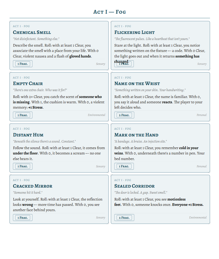 AnamnesiA deals with themes of trauma, guilt, loss, violence, and psychological distress. The game includes built-in safety tools (X-Card, Lines & Veils, emotional check-ins) and a mandatory Session Zero. Please use them.